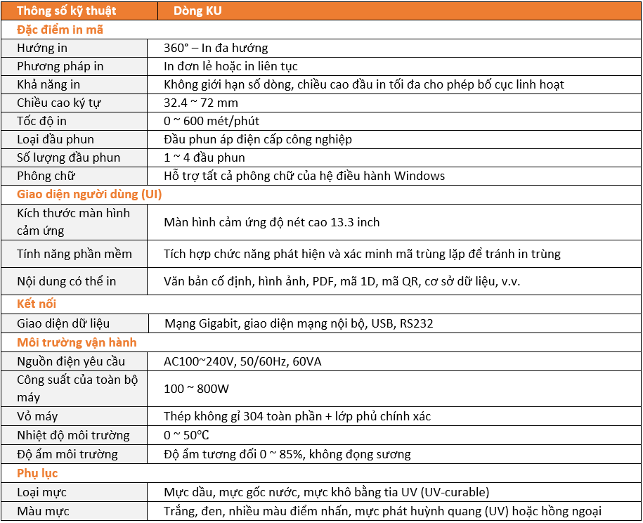 - Tốc độ in có thể đạt tới 60 mét/phút, và nội dung in bao gồm: tất cả các loại văn bản, số, ký tự, bộ đếm tự động, ngày giờ tự động, thông tin biến đổi với nhiều định dạng dữ liệu, mã vạch 1D/2D, hình ảnh cố định và biến đổi.