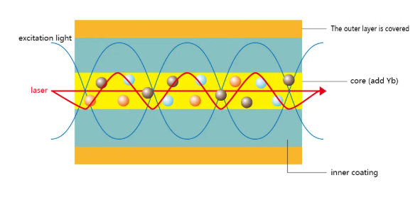 Các sợi khuếch đại (tiền khuếch đại và khuếch đại chính) được cấu tạo gồm ba lớp: lõi và hai lớp vỏ kim loại. Ánh sáng kích thích sẽ đi vào lớp vỏ kim loại bên trong và lõi có pha Yb, làm cho các nguyên tử bên trong lõi chuyển sang trạng thái kích thích. Tia laser được giữ lại trong lõi và được khuếch đại nhờ các nguyên tử kích thích đó, ánh sáng càng truyền đi trong môi trường thì năng lượng càng được tăng cường. Khác với laser thể rắn hoặc laser khí, ánh sáng trong laser sợi quang chỉ truyền theo một hướng và không phản xạ qua lại.