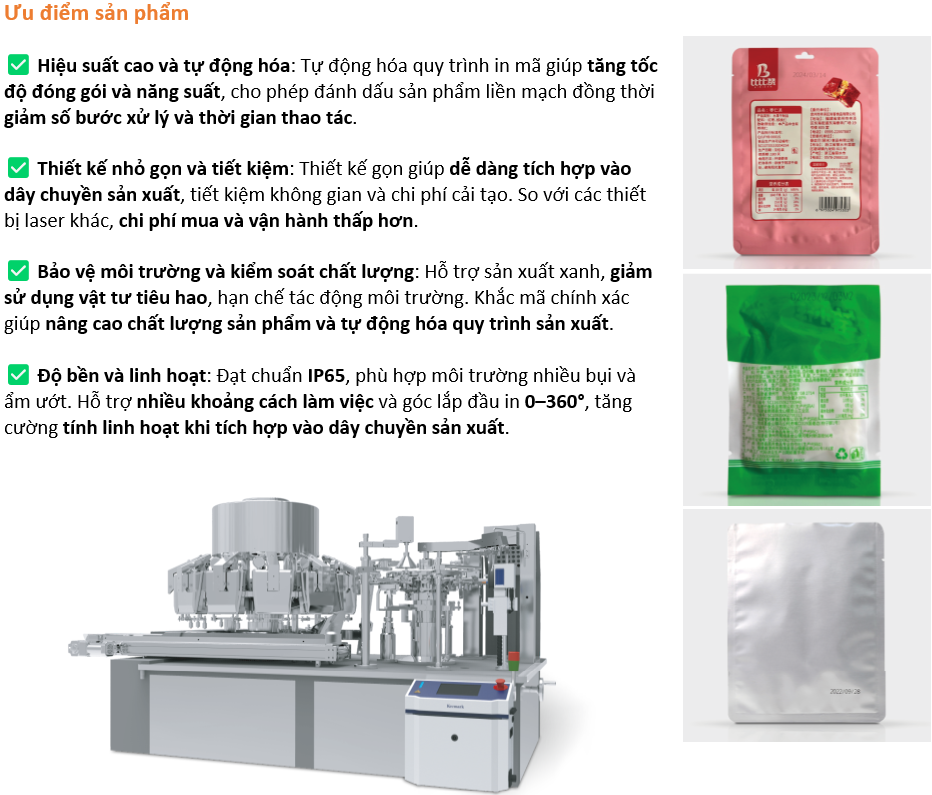 Máy khắc laser fiber dạng cấp túi được thiết kế đặc biệt cho dây chuyền máy đóng gói cấp túi, nhằm nâng cao hiệu quả và tính linh hoạt của quá trình đóng gói. Ứng dụng công nghệ laser không tiếp xúc tiên tiến, thiết bị có thể tạo ra các ký hiệu rõ nét và bền lâu trên túi, ngay cả trong môi trường ẩm ướt, dính dầu mỡ, nhiều bụi, hoặc khi tiệt trùng bằng nhiệt — đảm bảo thông tin luôn được đọc rõ ràng trong suốt vòng đời sản phẩm.